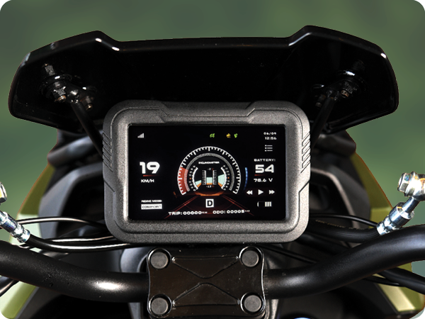 Interactive Touchscreen Speedometer Layar sentuh modern menampilkan informasi berkendara lengkap dan interaktif. |
